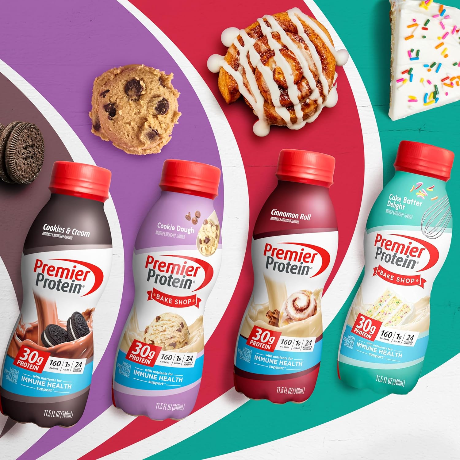 Packaged in a 11.5oz bottle, each Premier Protein Shake contains 30 grams of protein, complete with all the essential amino acids, 1g of sugar, 3-5g carbs (depending on flavor), 160 calories, 24 vitamins & minerals, and is also low in fat. We use a blend of milk protein and casein in our shakes to help fuel muscles quickly and for several hours to help support your goals. Enjoy a shake as a healthy snack, a breakfast on-the-go, an afternoon snack, or as pre- or post-workout fuel. They are delicious as is but are also highly customizable. Try blending with your favorite fruits and vegetables for a delicious smoothie or adding to cereal or oatmeal. Available in11 delicious flavors: Cinnamon Roll, Chocolate, Vanilla, Cafe Latte, Caramel, Cookies & Cream, Strawberries & Cream, Bananas & Cream, Peaches & Cream, Chocolate Peanut Butter, Cake Batter and Cookie Dough.