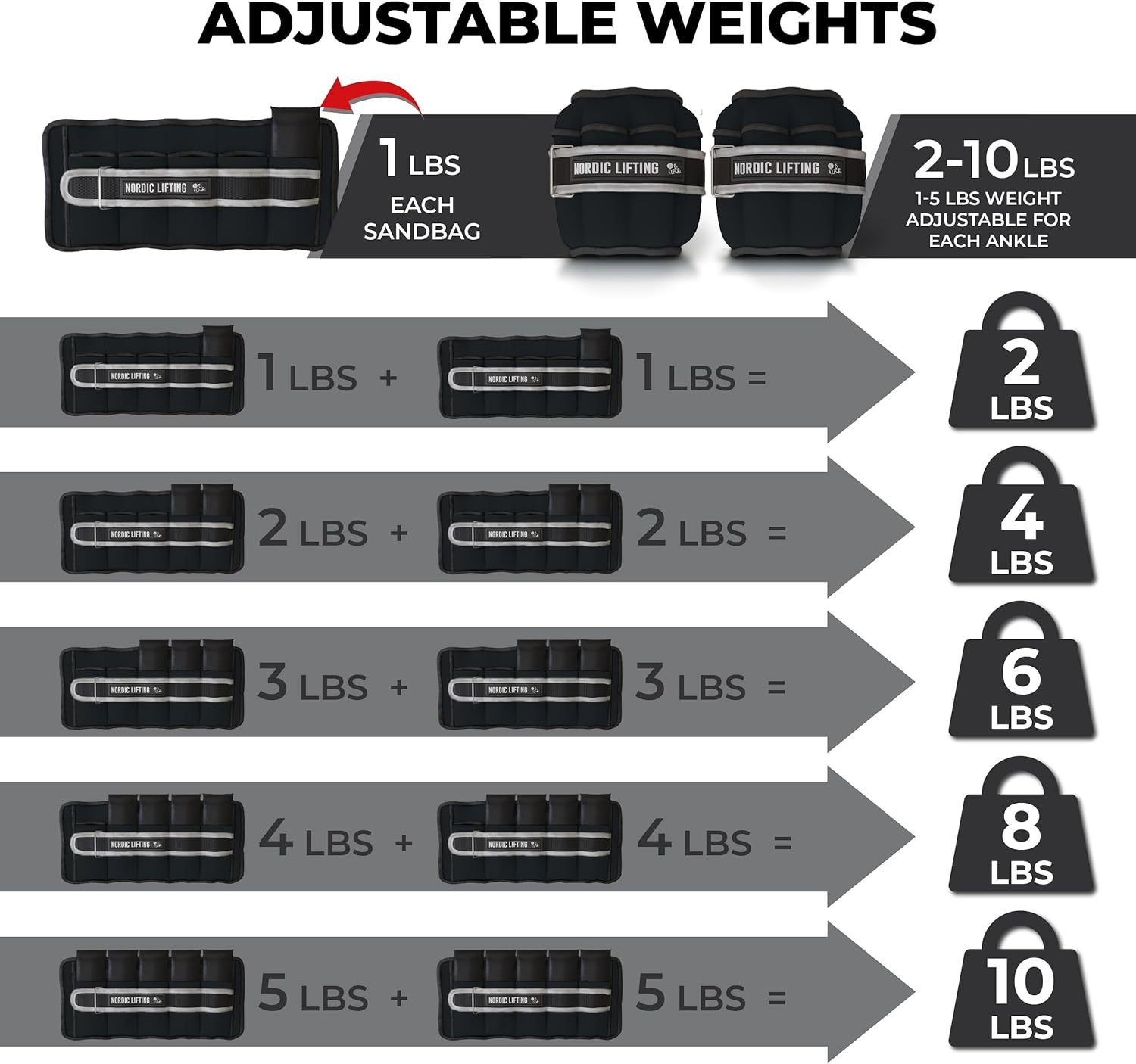 Adjustable Ankle Weights for Women and Men – 1 Pair 2 4 6 8 10 Lbs – Strap to Wrist, Hand or Leg for Gym & Yoga – Workout Equipment to Boost Weight Loss by Nordic Lifting